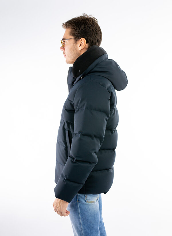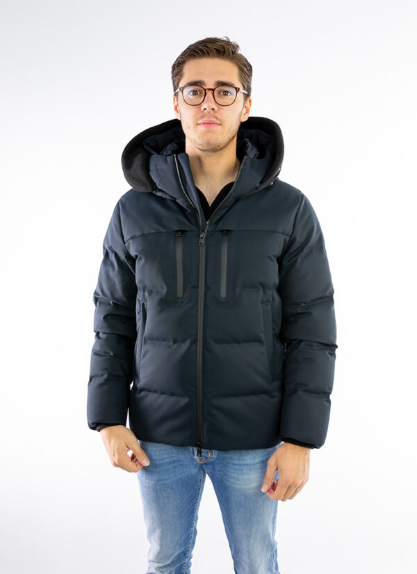 De veelzijdige en dynamische keperstof van waterdicht en winddicht polyester is gevuld met eendendons en versterkt met horizontale wattering met gesealde naden om de warmte binnen te houden.
